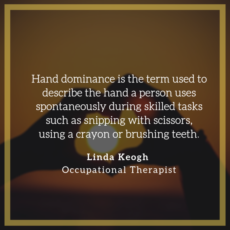 Hand dominance is the term used to describe the hand a person uses spontaneously during skilled tasks such as snipping with scissors, using a crayon or brushing teeth. It is the hand a child will prefer to use because it is more efficient. This then leaves the other hand in the role of stabiliser or for those who have attended therapy with me know fondly as “the helper’s hand”.